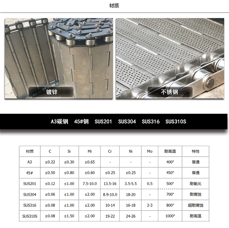輸送鏈板采用不銹鋼板沖壓成型,鏈條傳動,每節(jié)由6-25mm支撐桿連接,其運動平穩(wěn)、輸送力量大,適合用于輸送細(xì)小的高密度物件,輸送過程中運轉(zhuǎn)平穩(wěn),安裝更換方便,成本高,使用壽命較長。