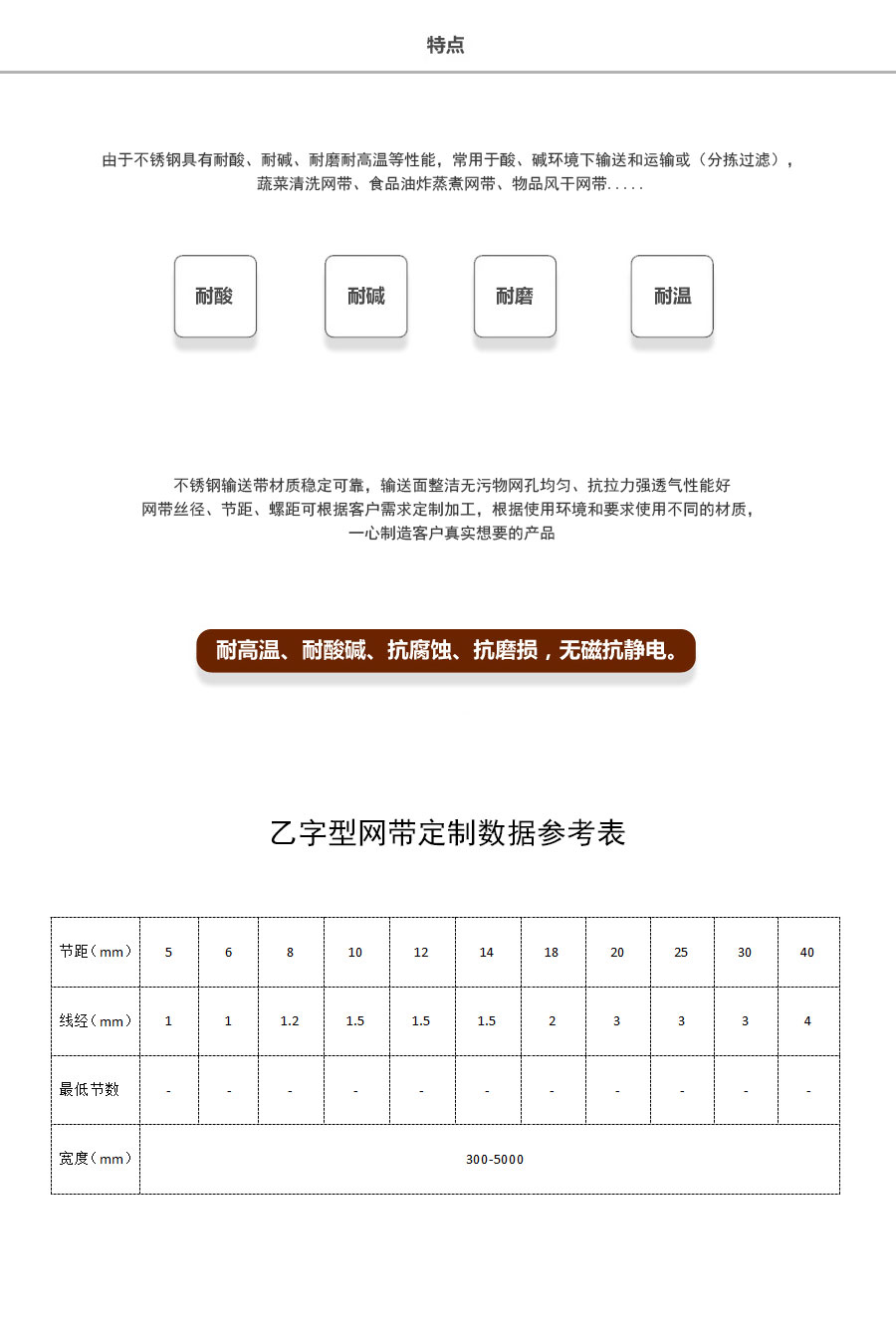 乙字型網(wǎng)帶又稱乙型網(wǎng)帶、食品網(wǎng)帶、巧克力網(wǎng)帶,使用不銹鋼高彈韌絲制作。網(wǎng)帶多用單小邊結(jié)構(gòu),雙小邊結(jié)構(gòu)用于特殊用途。可用于直線輸送機,也可用于轉(zhuǎn)彎運輸機。網(wǎng)寬300mm-5000mm,通常情況下用齒輪定位傳動。也可采用鏈條驅(qū)動。