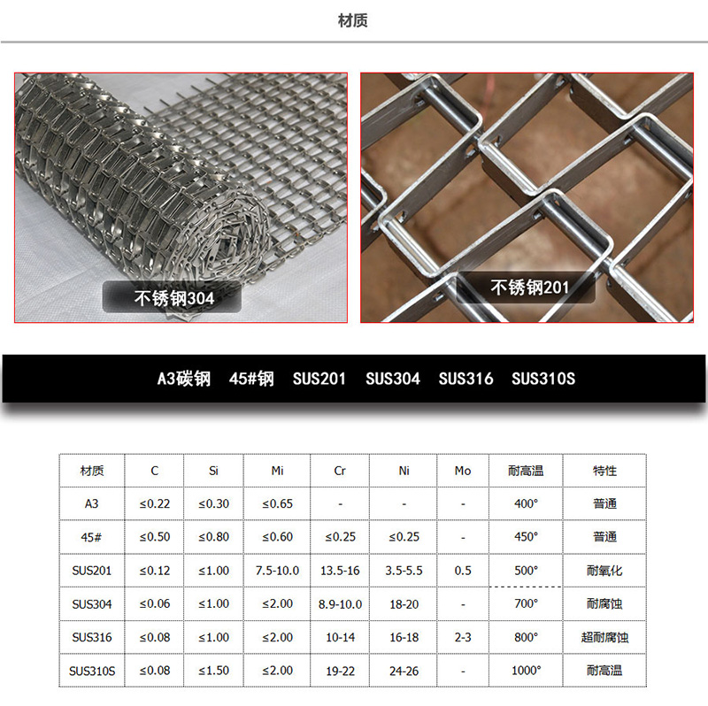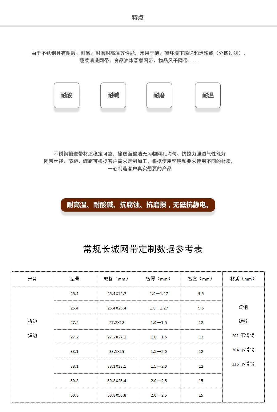 長(zhǎng)城網(wǎng)帶又稱馬蹄鏈,由扁平金屬片和圓金屬絲所組成,網(wǎng)帶自重輕,網(wǎng)孔空隙大,網(wǎng)面平整,運(yùn)行平穩(wěn),不會(huì)走偏。