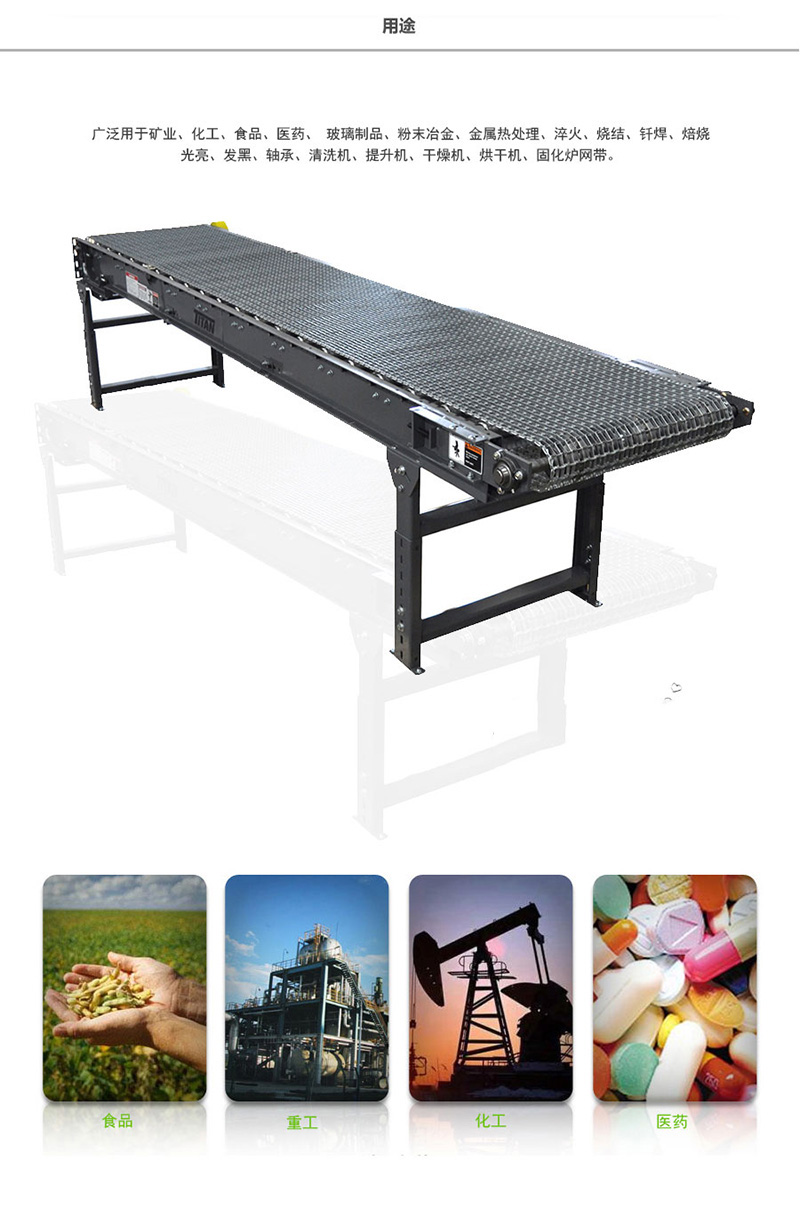 廣泛用于輕工機(jī)械、滅菌機(jī)、絲綢印染、食品、發(fā)電、制藥、服裝加工等行業(yè)的自動(dòng)線輸送。做洗滌、干燥、冷卻、熱處理的輸送線、食品面包線、冷凍機(jī)械中的螺旋塔輸送、噴涂、清洗機(jī)械以及重型輸送機(jī)械中普遍使用。